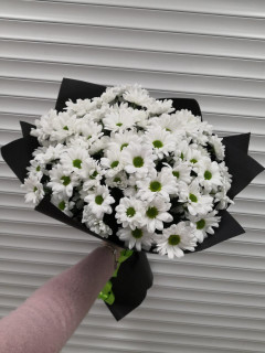 Для оформления букета выбрана стильная черная упаковка, которая добавляет нотку современности и утонченности. Матовая текстура бумаги создает эффектный контраст с яркостью хризантем, подчеркивая их естественную красоту.