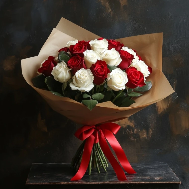 Этот изысканный букет, состоящий из 21 красной и белой розы, символизирует гармонию и единство в любви. Красные розы олицетворяют страсть и романтику, в то время как белые добавляют нотки чистоты и невинности. Вместе они создают великолепный контраст, который подчеркивает глубину ваших чувств. Розы бережно оформлены в стильную крафтовую упаковку, что придаёт букету естественный и современный вид. Букет из микса белых и красных роз станет идеальным подарком для любого важного события — будь то годовщина, день рождения или просто желание выразить свои чувства.
